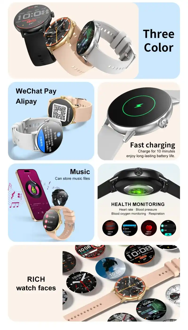 Sports, heart rate, Diapad, Active record, Sleep, Weather, Blood Oxygen, Music, Breathe, Sport History, Contact, Recents, Messages, Calculator, Game, Alarm Clock, Stopwatch, Timer, Flashlight, Find Device,Camera, Setting, Vibration strength, Brightness, Languages, Power save, Lock screen, USB mode, Reminder mode