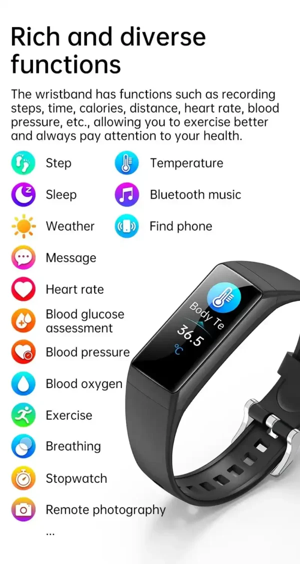 Heart rate monitoring; Blood pressure monitoring; Blood glucose measurement; Blood oxygen measurement; Body temperature measurement; Exercise measurement; Sleep monitoring; Weather and message notification; Alarm clock; Stopwatch; Timer; Music control; Find phone; Female menstrual cycle and ovulation reminder; Camera control; Step counting