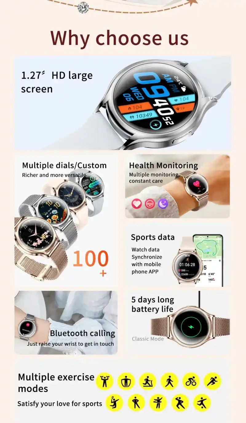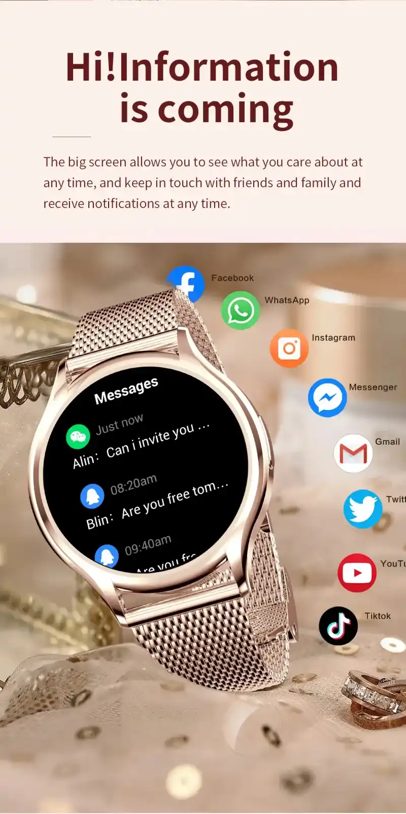 1.27-inch full circle full touch, master BT8959T5, call, electric reminder push, SMS reminder push, WeChat reminder push, QQ reminder push, exercise record (step counting, mileage, etc.), vibration, more than 100 exercise modes, 4 sets of themes, weather, sleep, heart rate, blood pressure, blood oxygen, sedentary/drinking reminder, music control, remote photo taking. Message reminder, looking for mobile phone/watch, vibration selection, quick message reply of incoming call, time setting, password screen locking function, breathing training, female physiology, stopwatch, timer, alarm clock, business card, calendar, sports history, do not disturb mode, power saving mode, low battery reminder, flashlight, voice assistant (SIRI), and games.