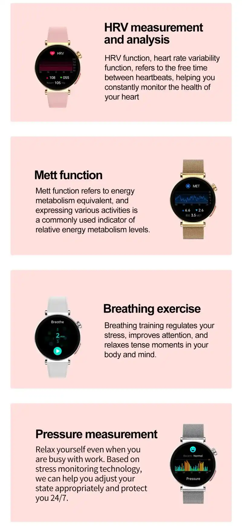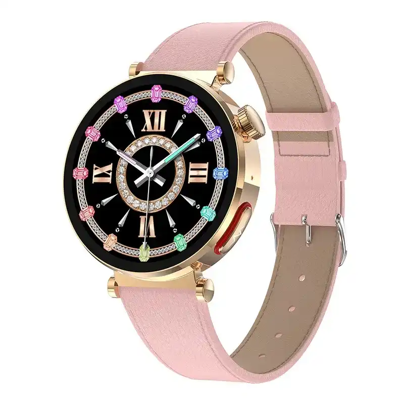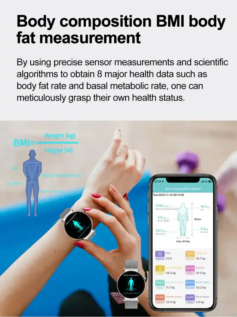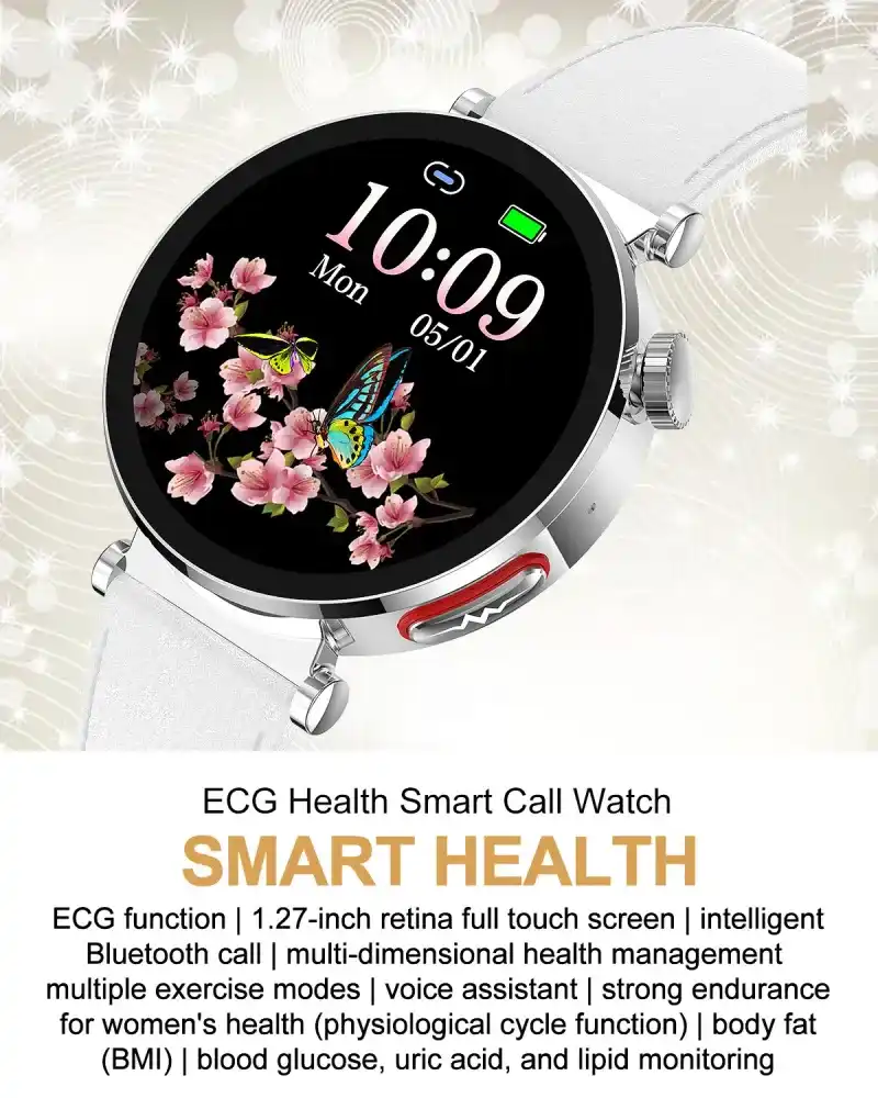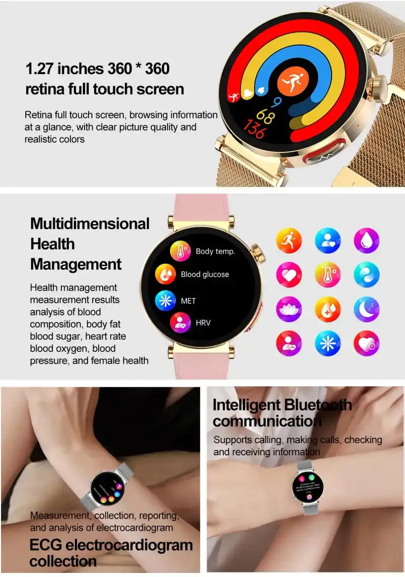 Female style (40 mm diameter gold wear size), ECG ECG function, 1.27 inch 360*360 resolution full touch screen, Bluetooth call, non-invasive blood glucose measurement, blood composition measurement (uric acid lipid function), body composition BMI body fat measurement, HRV function, AI medical diagnosis, Meto function, SOS emergency call function, Body temperature monitoring, blood oxygen monitoring, blood pressure monitoring, breathing training, stress monitoring, women’s health (period tracking), heart rate monitoring, sleep monitoring, sedentary reminder and other health functions.
