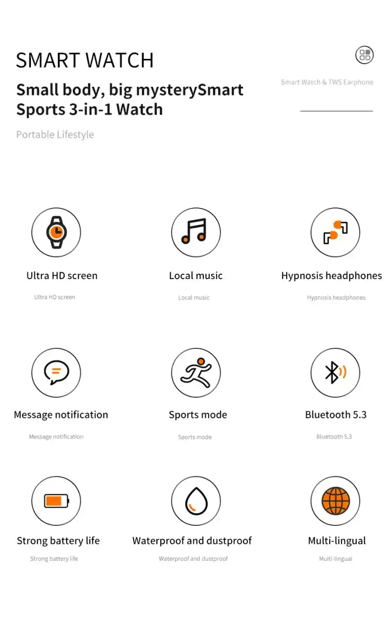 1. **Water and Dust Resistance**: Both the earbuds and the watch feature deep waterproof function with excellent waterproof performance.