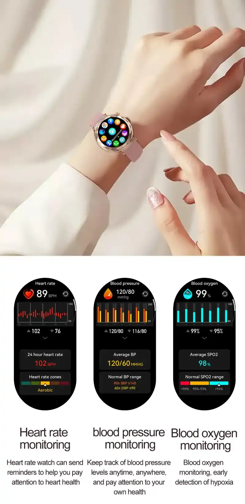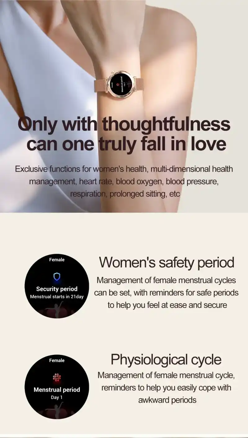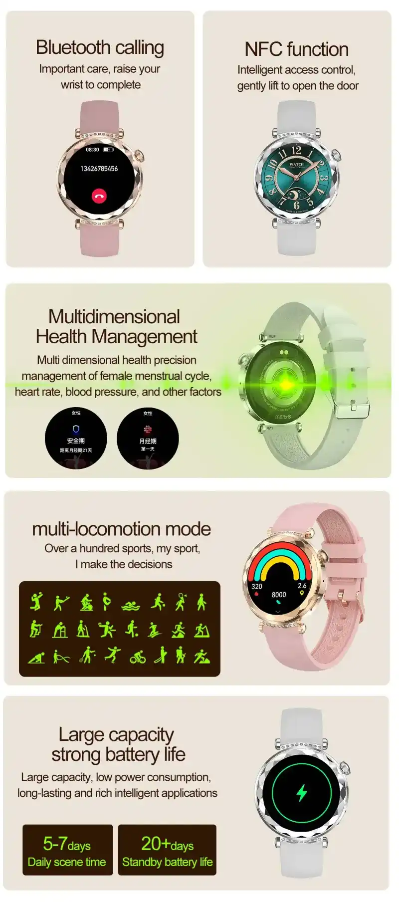 Bluetooth calling, voice control, always-on display, NFC, Alipay offline payment, breathing training, calendar, payment code, women’s health tracking, SOS, calculator, password unlock, custom watch faces, weather forecast, music control, step counting, heart rate monitoring, sleep monitoring, sedentary reminder, distance tracking, blood oxygen monitoring, blood pressure monitoring, search function, calorie calculation, message push