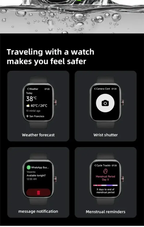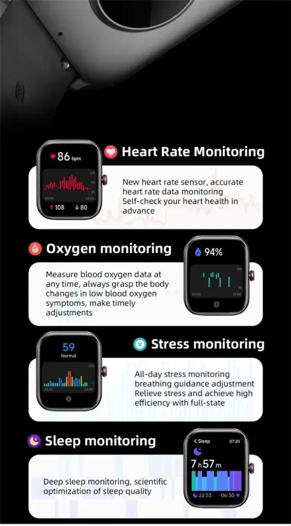 Heart rate monitor, Sleep monitoring, Pedometer monitoring, Calorie monitoring, Distance monitoring, Stress monitoring, Wear detection