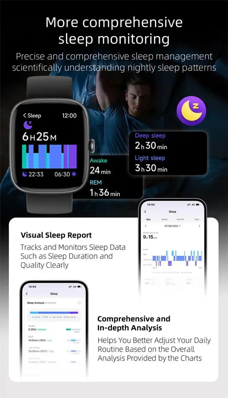 Comprehensive Health Suite: Equipped with precise sensors for 24/7 Heart Rate, SpO2 (Blood Oxygen), Stress Monitoring, and Scientific Sleep Analysis (REM/Deep/Light sleep).