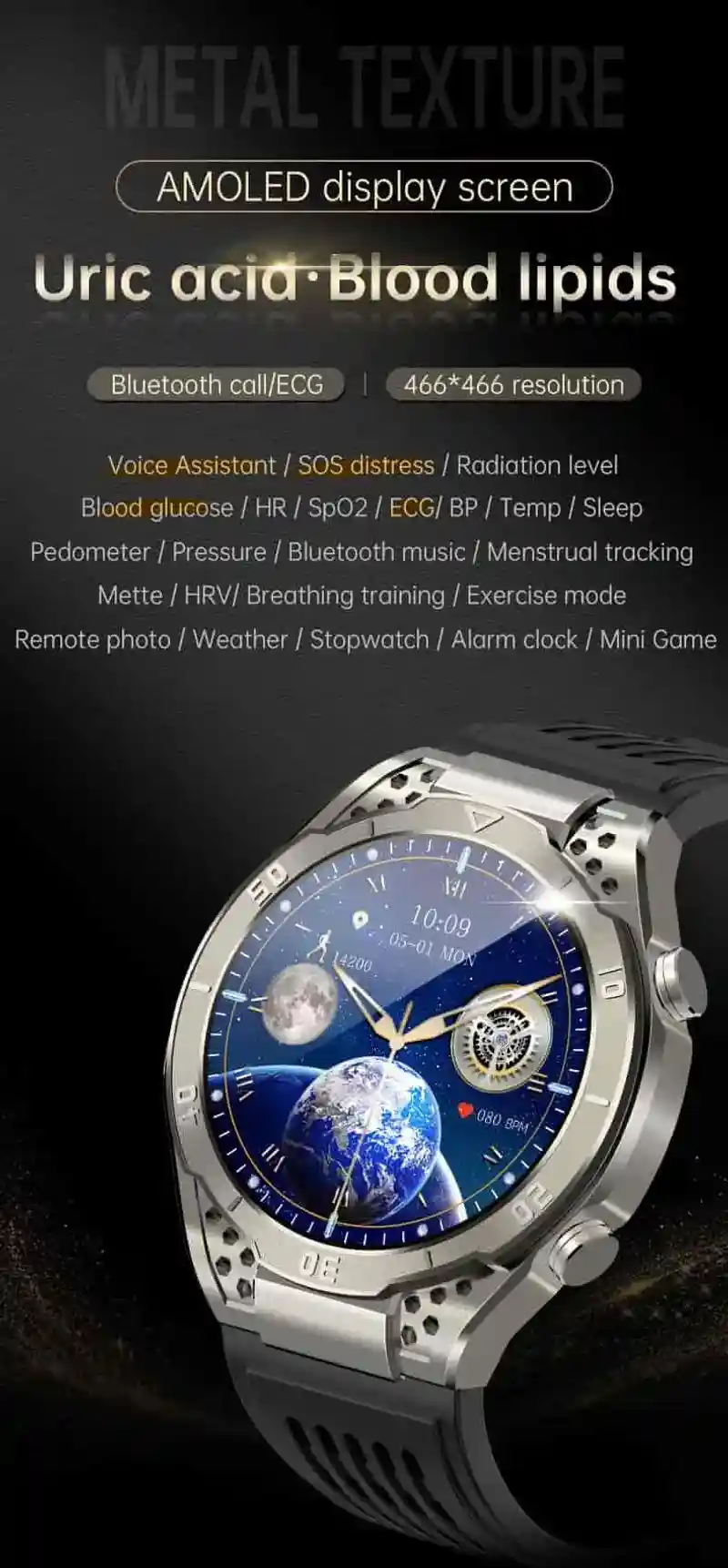 Bluetooth call, ECG, blood glucose, blood oxygen, blood pressure, heart rate, body temperature, NFC, play music