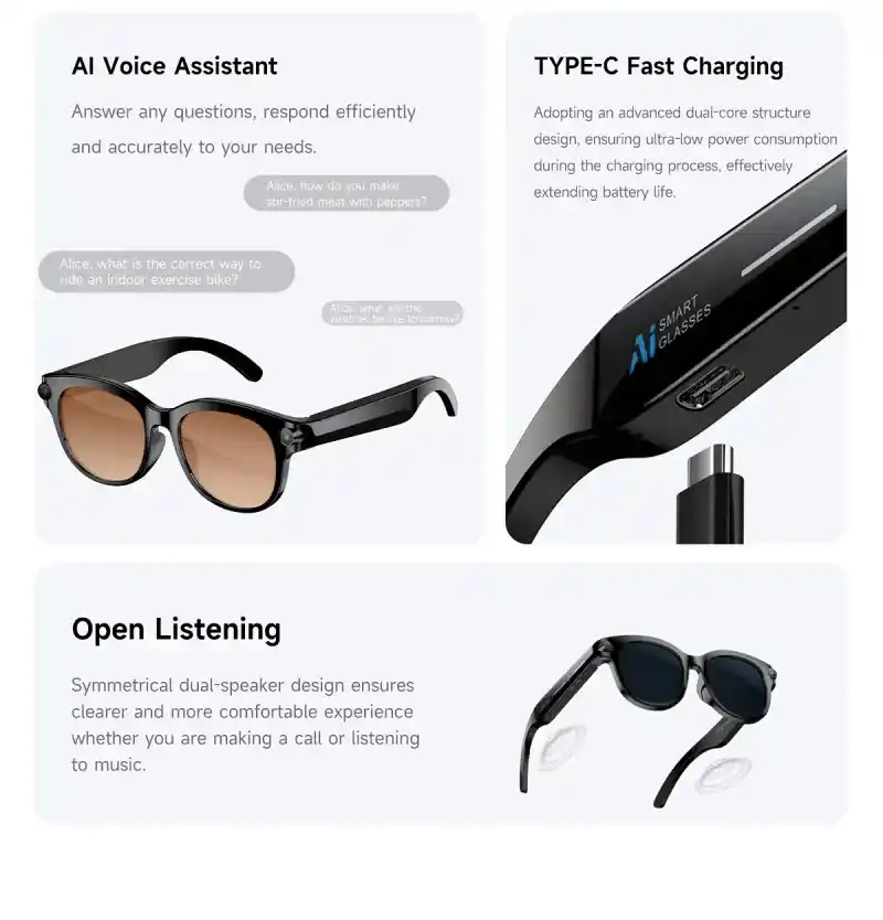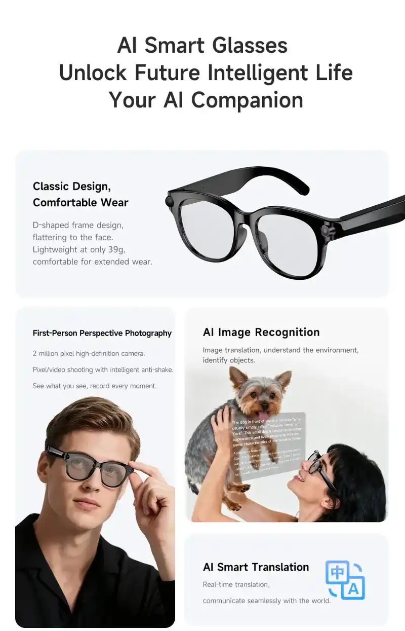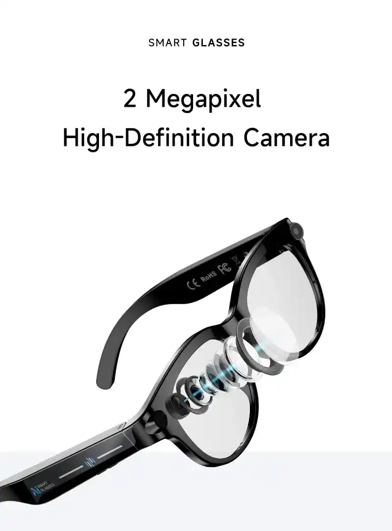 Accessories: Smart AI glasses, wired charging cable (data transfer supported), user manual, color box, cleaning cloth