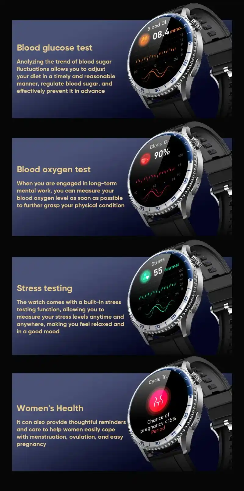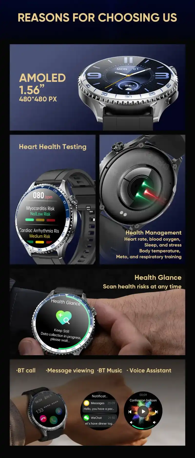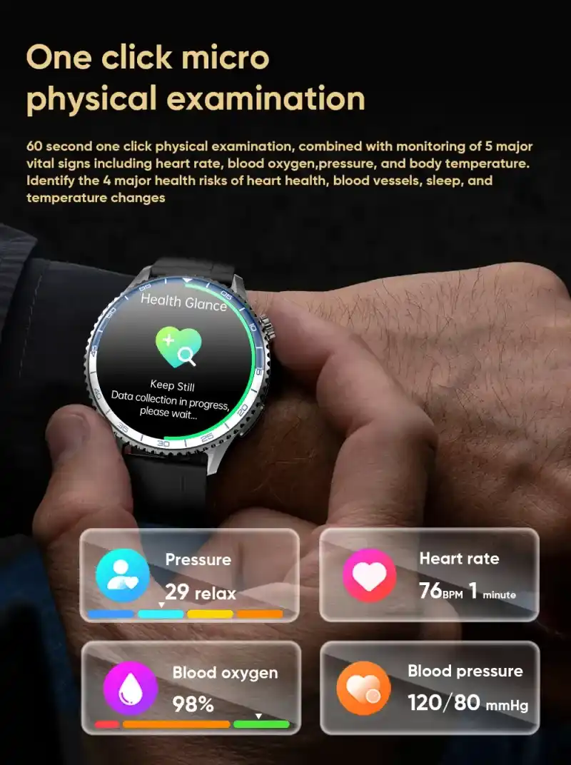 – Health & Communication: Bluetooth calling, ECG, ECG + PPG, multi-risk analysis for ECG diagnosis, body temperature monitoring, incoming call rejection, OTA upgrade