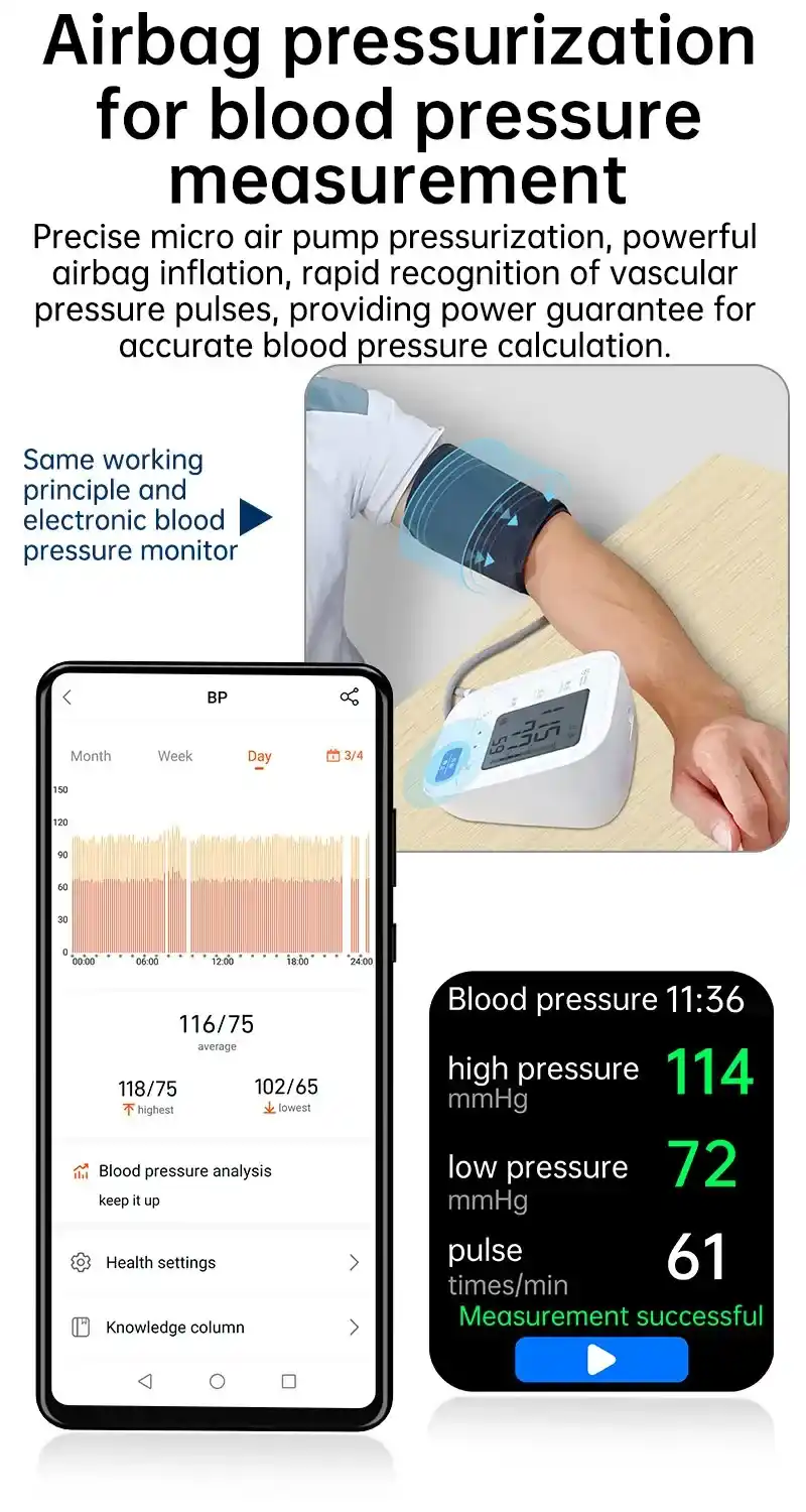 Full-screen touch interaction / Heart rate monitoring / Blood pressure monitoring / Blood oxygen monitoring / ECG detection / AI health analysis / Heart rate variability detection / Real-time temperature monitoring / Sleep monitoring / Snoring monitoring / Stress monitoring / Sedentary reminder / Step tracking / Multi-sport modes / Message notifications / Call reminders / Custom watch faces / Multiple dial themes / Bluetooth photo remote control / Weather display / Alarm clock / Stopwatch / Music control / Find-my-phone function / Women’s health tracking / LED flashlight function / Wrist-sense wake-screen / Long battery standby / Magnetic charging support