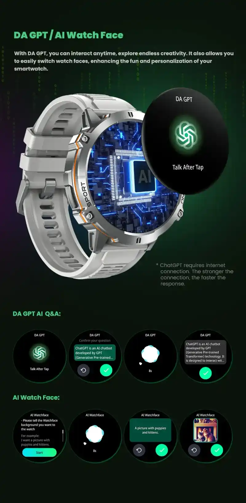 Watch Face: Built-in 11 watch face + 1 push watch face + 1 customization + 1 AI watch face