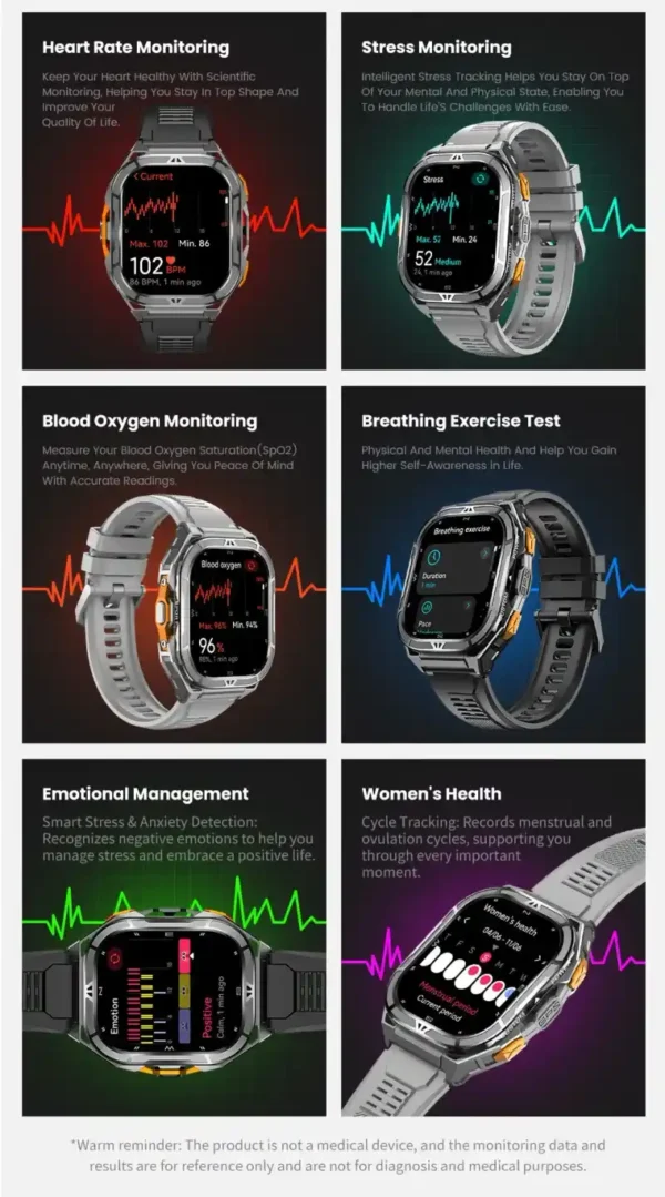 Basic Functions: Activity center (step counting, calories, distance), sleep detection, heart rate detection, sports mode (100+ types), GPS sports (4 types), exercise records, emotion detection, blood oxygen detection, stress detection, weather, Bluetooth calls, messages, remote photography, music control, breathing training, voice assistant, timer, alarm clock, stopwatch, women’s health, find mobile phone, calculator, DND mode, power saving mode, raise hand to wake up, brightness adjustment, sound and vibration, dial switching, menu style switching, exercise goal setting, control center customization, world clock, smart drainage, lock screen off the wrist, barometer, compass, one-key measurement, exercise recognition, cover lock, screen off display, time and date, silent mode, SOS function