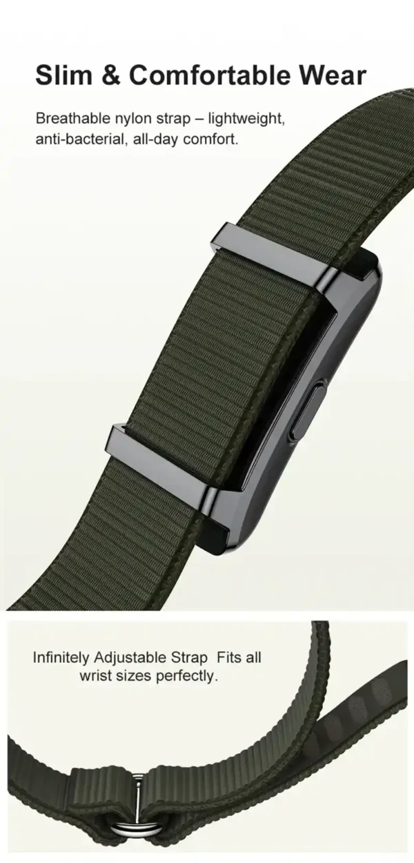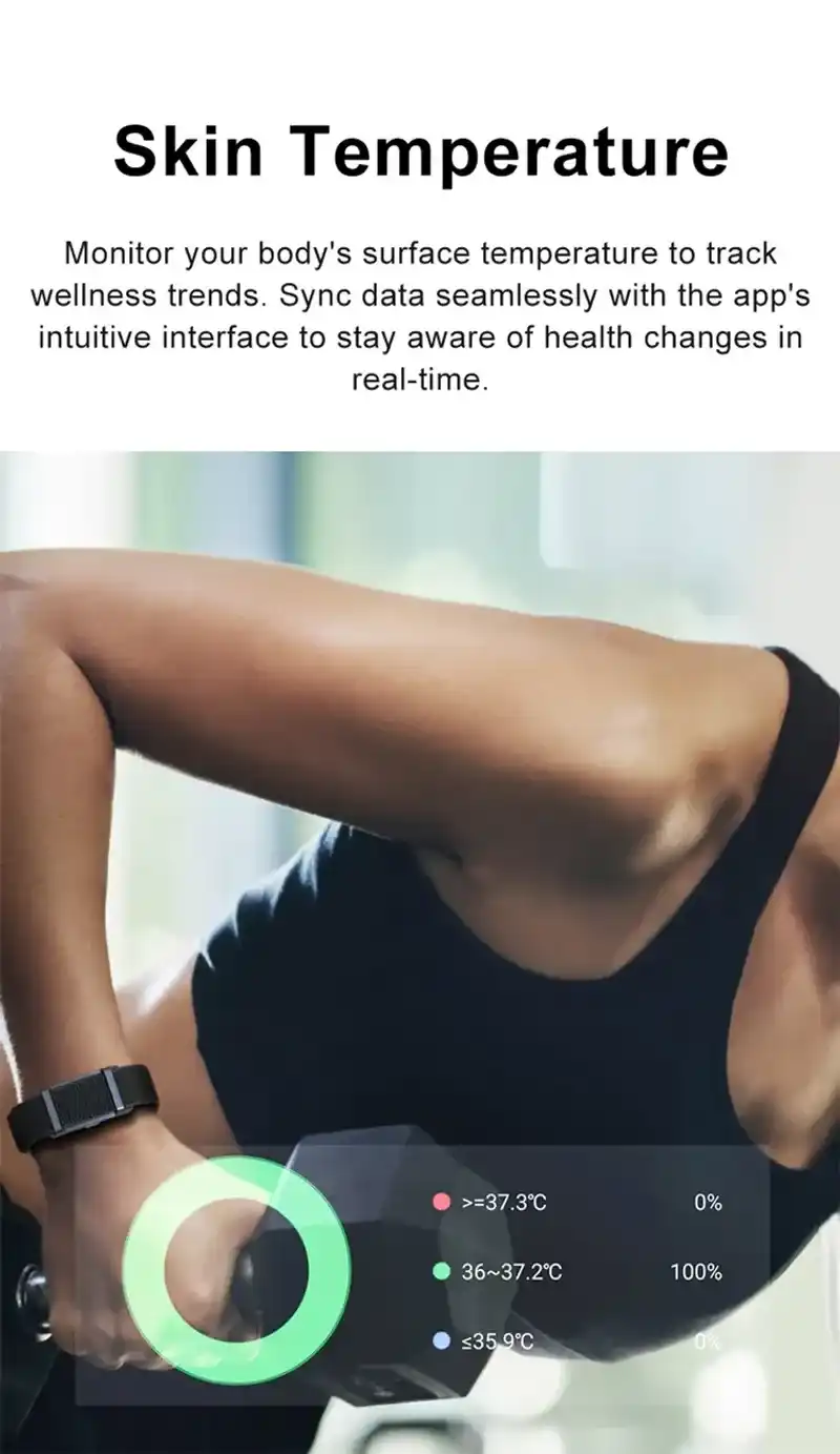 Major Function: 1> Exercise records: steps, distance, calorie calculation, exercise mode; 2> Message reminder: flashing indicator light, APP notification, etc; 3> Health management: heart rate HRV, Blood oxygen saturation and sleep monitoring; 4> Other functions: remote control for taking photos, searching for wristbands, low battery reminder, temperature measurement